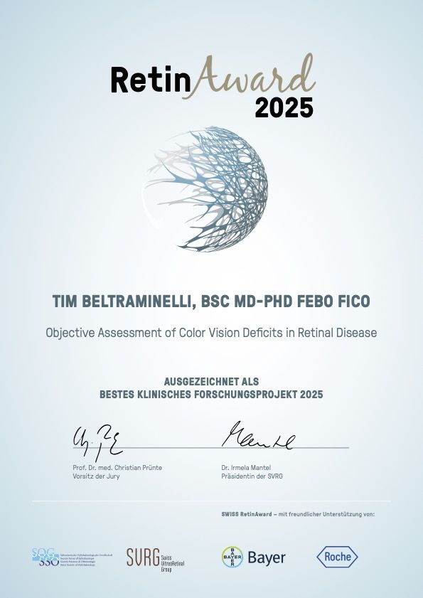 In diesem Jahr wurde das Projekt 'Objective Assessment of Color Vision Deficits in Retinal Disease' von Dr. med. Tim Beltraminelli als das beste klinische Forschungsprojekt 2025 ausgezeichnet und wird mit einem grosszügigen Preisgeld von CHF 20'000.– unterstützt.