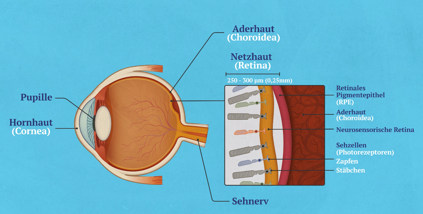 Die Netzhaut (Retina) ist eine nur etwa einen Viertel Millimeter dünne, hochsensible Schicht aus Nervenzellen im Inneren des Auges. Sie wandelt Lichtreize in elektrische Signale um, die über den Sehnerv ins Gehirn weitergeleitet werden. Erst dadurch wird Sehen überhaupt möglich.